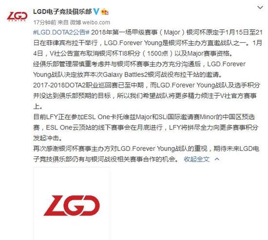 2018年第一场甲级赛事(Major)银河杯原定于1月15日至21日在菲律宾布拉干举行,LGD.Forever Young是银河杯主办方直邀战队之一。1月4日,V社公告宣布取消银河杯TI8积分(1500点)以及Major赛事资格。