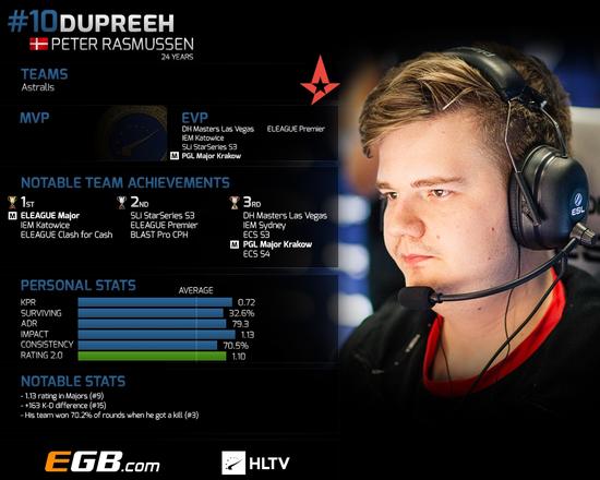 作为今年最稳定、最全面的选手之一,Astralis的dupreeh在今年的年度人物TOP20中位列第十名。