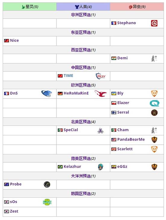 其余主要赛区中,竞争最激烈的韩国区聚集了当今世界上最顶尖的一批星际2选手,经过两天的激烈争夺,狗哥sOs和Zest最终出线;欧洲区共分为五个分赛区,最终芬兰新星Serral、波兰虫王Elazer、乌克兰老将Bly、法国选手DnS以及德国老将HeRoMaRine拿到参赛资格;北美区因为赛程冲突原因被分为两个阶段进行预选赛,最后由墨西哥双雄Cham和Special、噶姐Scarlett和新近崛起的美国虫王囧雪诺JonSnow四位选手拿到正赛名额,南美区巴西人皇Kelazure和哥伦比亚选手eGGz携手晋级。