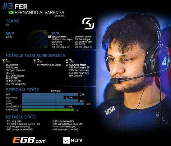 荣获Top20榜单第三名,是来自于SK Gaming的Fernando “fer” Alvarenga,他是如今世界上最稳定也最具影响力的选手之一。