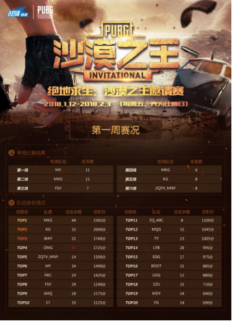 《绝地求生:沙漠之王邀请赛》第一周比赛,六场赛事赛况如下: