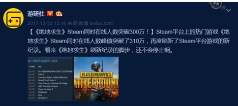 蓝洞于12月21日更新了《绝地求生》的正式服版本,枪械射击体验、沙漠新地图等全新内容的引入带给玩家不少新鲜感,更带动Steam同时在线人数峰值突破310万,再度刷新了Steam平台游戏的新纪录