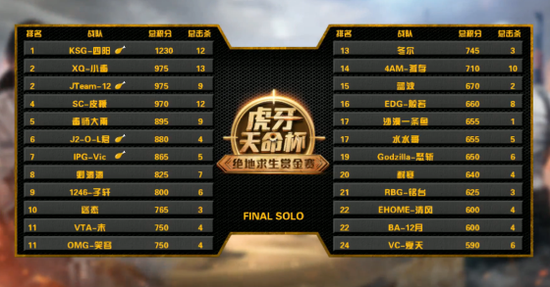 四局SOLO赛战罢,四阳1230分12击杀高居榜首拿下SOLO赛冠军以及5万奖金。小毒虽然跟JTeam-12同为975分,不过人头优势力压对手拿到第二,JTeam-12屈居第三。