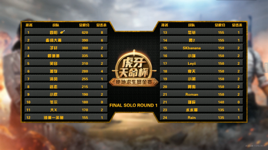 1月17日虎牙天命杯绝地求生赏金赛SOLO决赛开启,首局比赛落地就是一场腥风血雨,职业战队选手也难逃落地成盒的命运。相对于城区,更多的选手都是在野外打野阵亡。一圈毒之后仍有大量选手生存,不过提抢占了房区的选手自然更占优势。随着毒圈越来越小,毒圈提前过滤掉了房区所在的位置,树林中两名职业选手子轩跟四阳解决完其余人之后进行1V1对决。最终四阳毒圈占优再用手雷逼迫走位后完成击杀斩获头名。首轮战罢四阳凭借完美发挥8杀吃鸡暂居榜首。