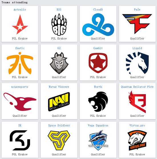 Cloud9、G2、mousesports、NaVi、QB.Fire、Space Soldiers、Vega、Liquid(加赛晋级替补100 Thieves)