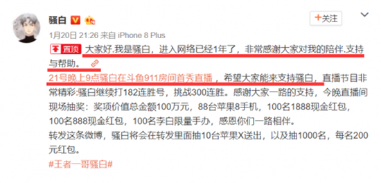 这件事到底有多火呢?先来看看骚白这条宣布加入斗鱼的微博流量吧!