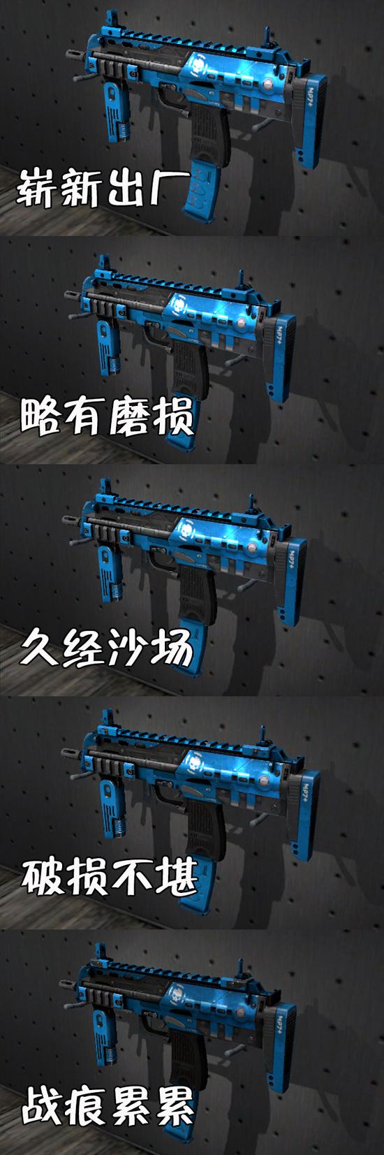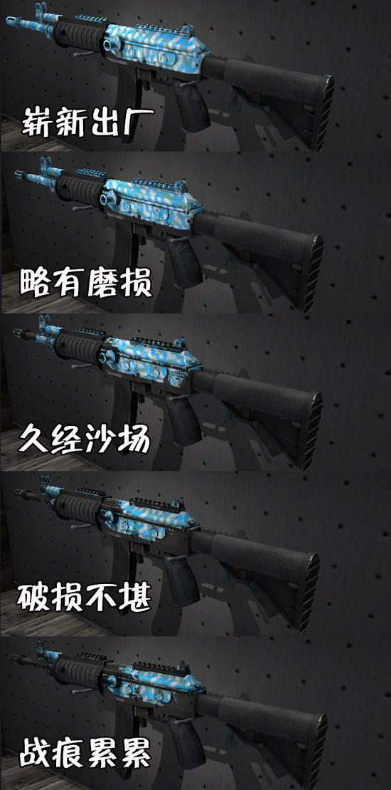 水蓝阶地是款卡磨损皮肤,磨损区间为0.00<<0.70。水蓝阶地极为吃磨损,即使崭新出厂依然会看到明显磨损。所以从外观来看,只推荐崭新出厂,磨损越低越好。
