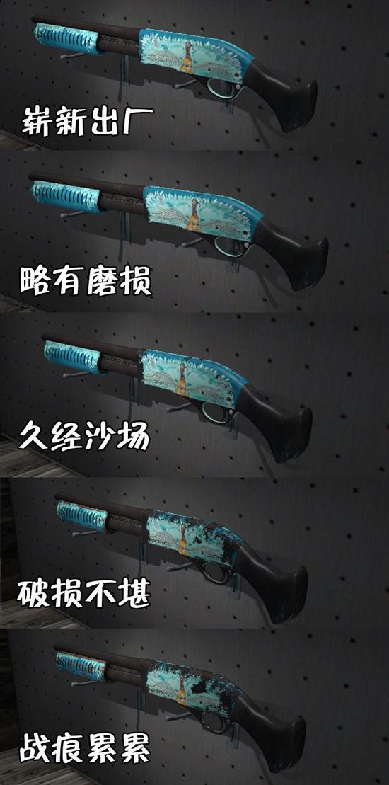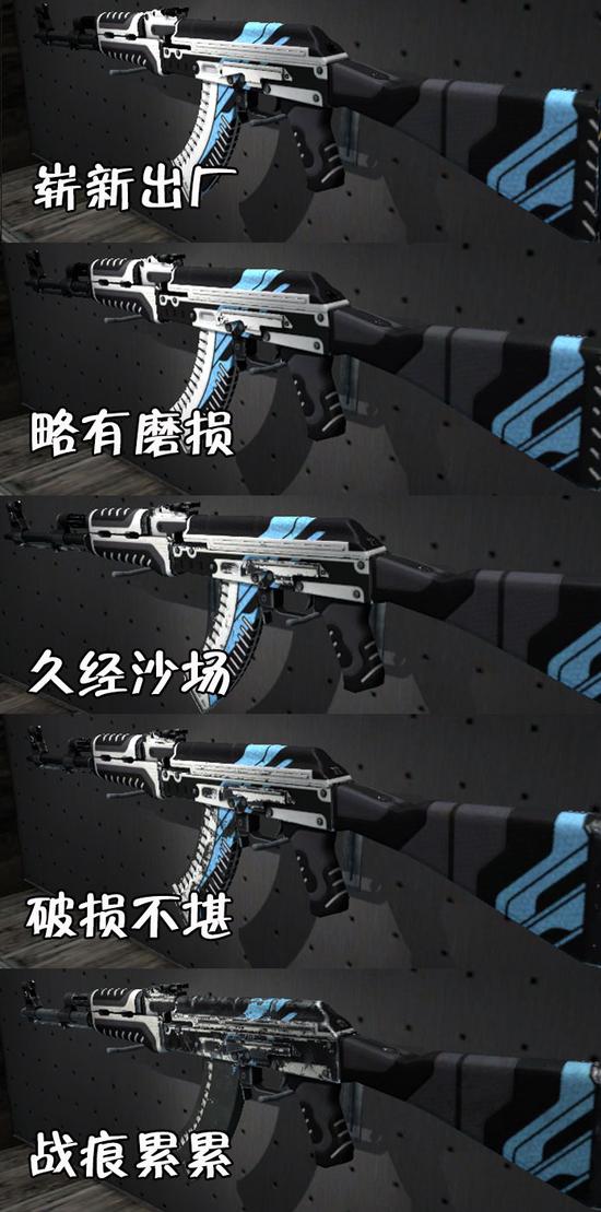冰冠是卡磨损皮肤,磨损区间为0.00<<0.50。冰冠很是吃磨损,即使崭新出厂也会看到明显的磨损,主要磨损点在枪身凸起处。从外观来看,推荐崭新,而且磨损越低越好。