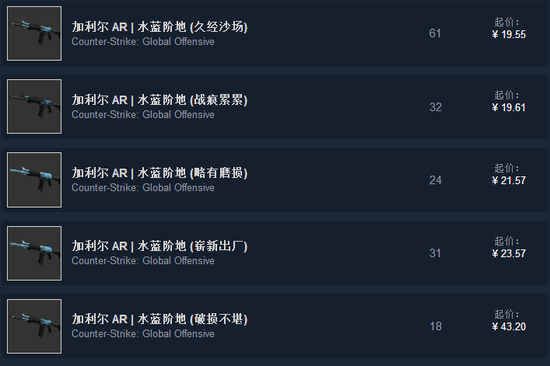 水蓝阶地的价格区别不大,图中破损不堪的那个不用在意,数量少价格挂的高也没用。崭新不过24元,只比久经和战痕贵4块,所以只买崭新就好。