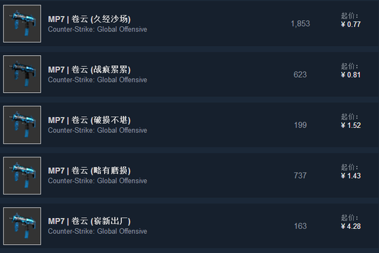 在UMP45遭削弱后MP7出厂率明显提高。卷云不吃磨损,价格便宜是许多玩家的选择。久经才几毛钱,崭新也不过5块钱。所以对于不吃磨损的皮肤来说,随便选。