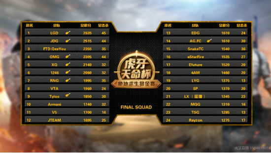 来到紧张的积分计算环节,JDG和LGD双双倒在决赛圈外,其余的排名靠近队伍均没能幸免,最终,LGD依然稳居榜首,成功获得了30万冠军奖金。而韦神所在的4AM则获得了第12名的成绩,略显可惜。就此,天命杯全部的比赛已经告一段落,让我们恭喜LGD战队的加冕~
