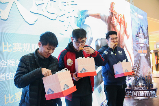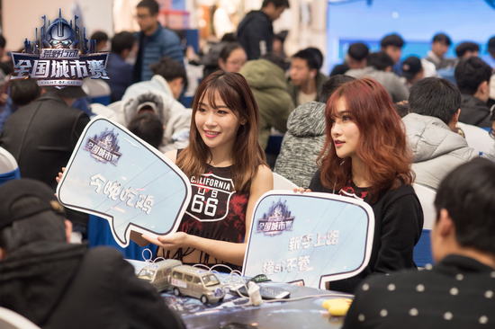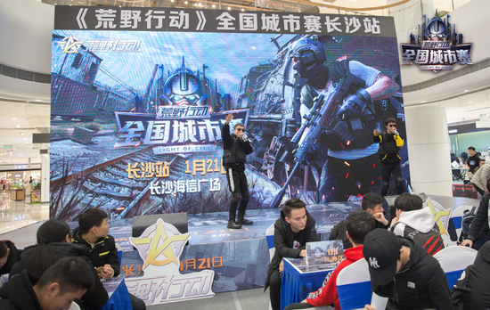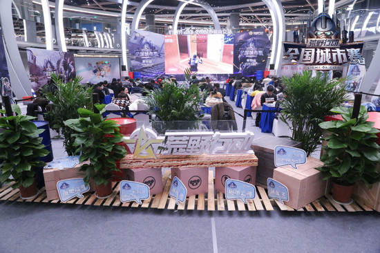 在上周三城举办的全国城市赛中,可谓亮点颇多。虽然荒野大主题不变,但在风格上可迥然不同。南京站的比赛现场加入了众多《荒野行动》中的道具元素,如空投箱,汽油桶等很好地还原出了游戏中荒野仓库风格。此外为荒野地图定制的文字云墙更是成为了每一位玩家争相前来的“留影胜地”。