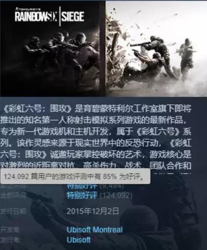 其实《彩虹六号:围攻》自2015年12月在Steam发行以来,已经收到了12万多条评价,其中85%的玩家给予了好评。