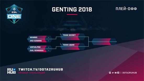 经过小组赛三天的激战,ESL ONE云顶2018即将进入到主赛事阶段。16支战队经过厮杀决出6支晋级主赛事名额,A/B组头名Secret以及Liquid两位大魔王小组赛一路过关斩将直接锁定四强,以逸待劳等待他们的对手出现。剩下的Newbee、VG、VP、EG则是需要经过一轮比拼才可继续前行。具体对阵如下: