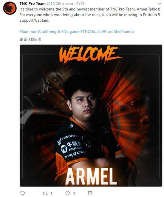 TNC官方宣布了他们的新人选,前CG战队选手Armel加入。由于Armel司职中单,前中单选手Kuku转职五号位并担任队长。
