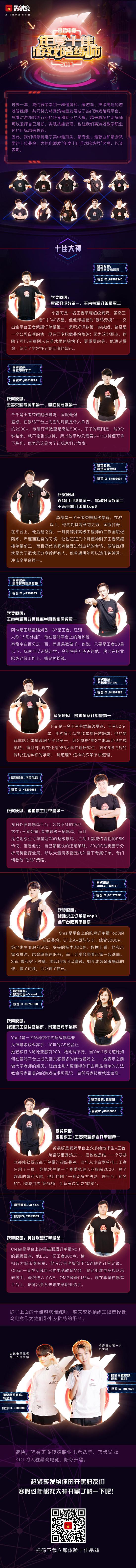 最后值得一提的是,2017年让“吃鸡”这个词火遍整个游戏电竞圈,而吃鸡游戏又是“陪玩”行业的风口。因为从跳伞那一刻开始,你的游戏伙伴就直接决定了游戏体验的质量。而随着国服绝地求生端游手游的陆续上线,2018年定会是国内的“吃鸡”爆发年,在如此利好的条件下,可以预见这个以暴鸡电竞为首的陪玩行业将会走到一个新的阶段。