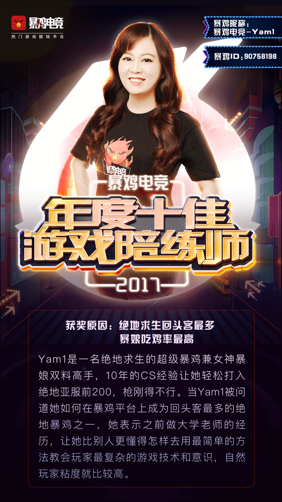 我们采访到的第二位陪练师Yam1,是本次获奖中唯一一位女性。作为女性玩家,她的枪法却完爆很多男性玩家——她是绝地求生亚服前200玩家。特别的是,她不仅在暴鸡平台《绝地求生》陪练业务中的订单量很高,还组建起了一支14人的专业陪练团队并担任组长,开始有规模地进行陪练教学。除了陪练师,Yam1还有一个不为人知的身份——大学老师。凭着7年的大学教学经历,她迅速建立起一套如何教导玩家游戏的陪练方法论,从一对一教学,到“课后练习”,甚至到维系长期客户,都有自己的心得。至于为什么选择全职做游戏陪练师,Yam1说,这是她第一次感觉到自己在做一份真正热爱的工作,自己从小玩游戏就玩得很好,但是真的靠游戏赚钱,以前没有想象过。而且以前教学生的东西,他们可能考试完马上就忘了,现在能真真切切地看得到自己的“学生”们在游戏里枪法一点点的在进步,自己非常有成就感。“在平台上,玩家们都叫我老师,不叫我大神的呢。”Yam1说。