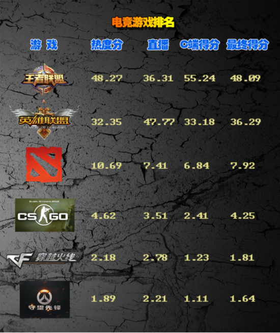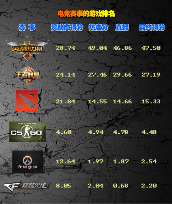 根据观看游戏赛事直播人数、赛事热度、赛事规模等,总结出相应的排名。
