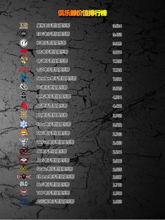 在2017年下半年度,文化部市场司上网服务行业转型升级网根据各大俱乐部在各个电竞游戏的比赛成绩与影响力进行了排名。在排名中RNG、EDG、IG位列前三。