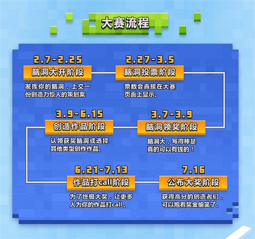 本次大赛分为六个阶段,第一个阶段为脑洞大开阶段,各位冒险家要做的就是,发挥自己的脑洞,上交一份独具创造力的脑洞构思。第二个阶段“脑洞投票”,只要你的脑洞够大够亮眼,最终就会在众多脑洞中脱颖而出获得脑洞大奖!从第三个阶段“创作作品”开始,各位创造者们就要认领获奖脑洞或选择其他类型来开始创作自己的作品啦。经过作品打Call阶段拉票后,《我的世界》创造者大赛将在7月中旬进入最后阶段:公布大奖,获得高分的创造者就可以拿到最高数十万大奖啦!