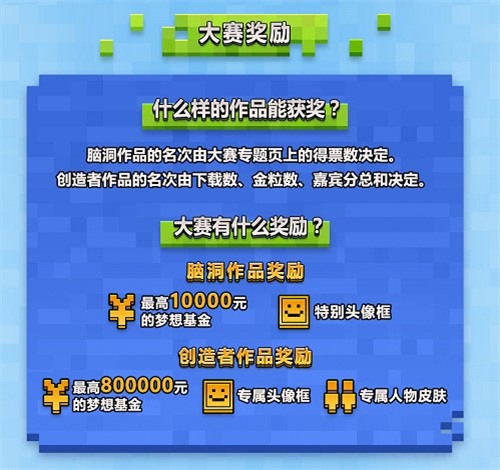 在大赛的策划征集阶段,所有冒险家都可以贡献自己的创意。脑洞作品的名次将由大赛专题页上的得票数决定,最后通过开发者的认领和实现,你很有可能在《我的世界》中国版看到属于自己的原创游戏,获得高达万元的实际奖励和《我的世界》特别头像框。