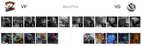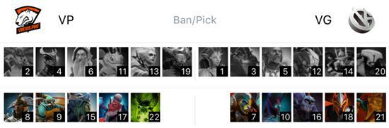 双方BP如图所示,VG拿了一套虚空+4智力法师的团战阵容,而VP拿出了一套小控制、爆发都很足的阵容。