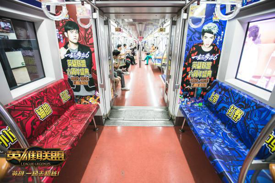 去年在北京五棵松体育馆盛大开幕的《英雄联盟》六周年庆狂欢盛典,也是非常有排面的。北京地铁的一段车厢直接化身英雄联盟六周年主题包厢,一些游戏元素和玩家常用的游戏语也出现在地铁中,引得不少人围观,就连地铁口也充满了六周年的元素。