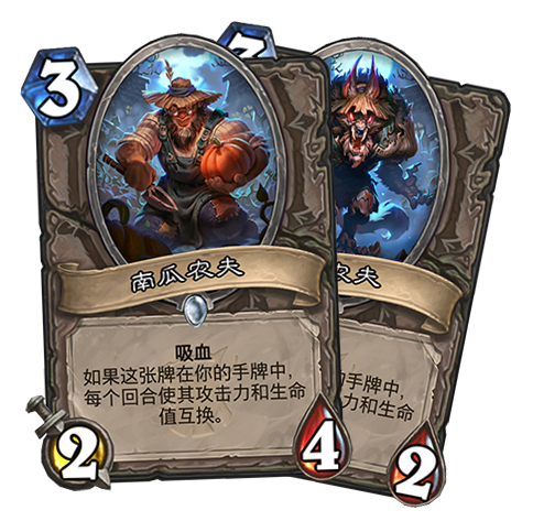 除此之外,还有一些更加有趣的新卡牌。很多人都知道,吉尔尼斯人都有一个可怕的秘密,在他们生命受到威胁的时刻,会变身为体型巨大且恐怖的狼人。 “南瓜农夫”这张卡牌便是一张狼人牌,当它在你手牌里时,每个回合它的攻击力和生命值都会互换,因此你可以自由选择想要的效果以及时机出手。