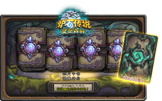 《炉石传说》最新扩展包的预购已经正式开启,现在预购“女巫森林”奥术之尘礼包即可获得50点奥术之尘,并获赠50包“女巫森林”卡牌包、1张“黑暗森林”卡背以及额外的20包“女巫森林”卡牌包。