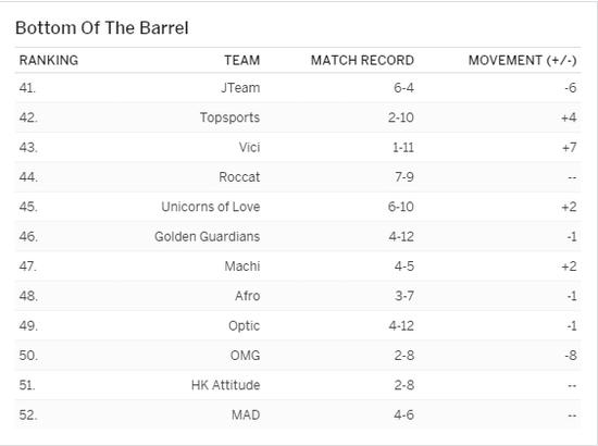 SNG已经在这个位置上很久了,在输给了Snake、WE和EDG等队后,SNG拿下了应该拿到的比赛,包括对FPX的关键性胜利。他们可以从强队手中拿下一局,但可惜不是一个系列赛,SNG经常能在比赛中展现出强队应有的影子。但就像往常一样,SNG也有着阵容决策上的失误,他们难以从对手的失误中抓住机会。综上,尽管输掉了一些比赛,他们还是坚挺的排在前20