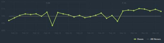 新版本Doom唯一值得注意的加强是+2初始智力,这足够让他在7.10版本获得近1%的胜率提升。24点魔法值相当于增加了10%的初始总魔法,这可以让Doom更多的使用技能。如此一来Doom在线上的续航得到了一些加强,在双人路也可以打得更加激进。