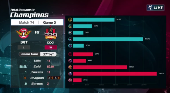 BBQ利用这条大龙BUFF直接拿了三路高地。35分钟BBQ抓死了奥拉夫拿下大龙没有给SKT机会直接中路强开再杀中上。BBQ顺势一波赢下比赛。