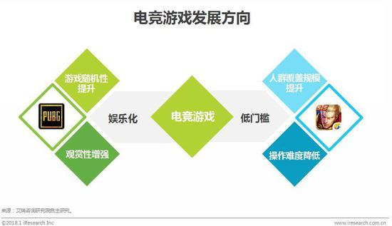 在提升娱乐性方面,《绝地求生》将优秀的游戏模式进行完善,极大地提升射击类游戏用户的娱乐体验与观赏性;在降低门槛方面,两者均拓展了该游戏类型的用户人群。艾瑞咨询认为,未来市场不断推出的各类电竞新产品,也会在这两个方向上深化发展。