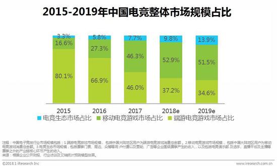 由于头部游戏的迅速增长,中国移动电竞游戏市场占比迅速提升,在2017年已经与端游电竞游戏市场占比持平。预计未来随着更多移动电竞产品出现,整体市场占比将会进一步提升。值得注意的是,尽管整体市场规模在迅速扩张,电竞生态市场的占比在稳步提高。艾瑞咨询认为,尽管目前市场规模占比较低,未来电竞生态将会是市场增长的重要来源。