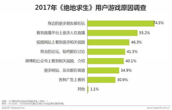 绝大多数的用户去玩《绝地求生》的主要原因是身边朋友的推荐。尽管在直播平台上非常火热,因为观看直播而去游戏的用户占比为55%,远少于朋友在玩带来的影响。另一方面,超过70%的用户都为这款游戏进行了电脑设备升级,证明了热门游戏带动整个电脑设备升级现象。