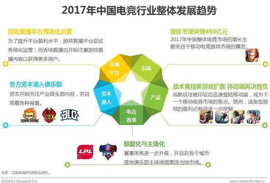 从2017年年初的《王者荣耀》到年末的《绝地求生》,从在线网游直播到线下明星对战,一个个热词无不展现着电竞行业的火爆。如今,电竞行业已进入高速发展阶段,在各种资本对电竞行业链头部进行布局的同时,行业本身已经逐渐成熟进入了主场化赛事的新时代;另一方面,更具娱乐性与观赏性的新产品大量登陆市场,与移动电竞共同成为行业发展的新动力。那么,中国电竞行业到底具有什么样的市场?未来的发展趋势是什么?本报告将从市场、资本、游戏、赛事等多方面探索中国电竞行业的现状,展望电竞行业的未来。
