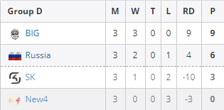 D组称得上本次比赛的死亡之组,俄罗斯队、BIG和SK都分到了其中,而同组的中国战队New4在比赛开始之前因故退赛。