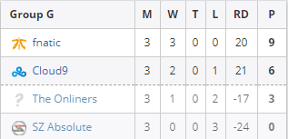 G组的Cloud9和Fnatic早早就从加拿大队伍The Onliners和日本队伍SZ Absolute身上取得两胜,锁定了自己的出线资格。最后一场C9和Fnatic的小组第一之争在Mirage上进行,进攻方起手的C9第三局就起出全甲AK拿到三分,但上半场剩余时间KRIMZ手感火热,经常在A点拿到多杀,之后进攻方一分未得。下半场C9虽然赢下手枪局,但面对瑞典人凶狠的中路拼抢,还是败下阵来,最后Fnatic以16:8的比分击败C9,获得小组头名。