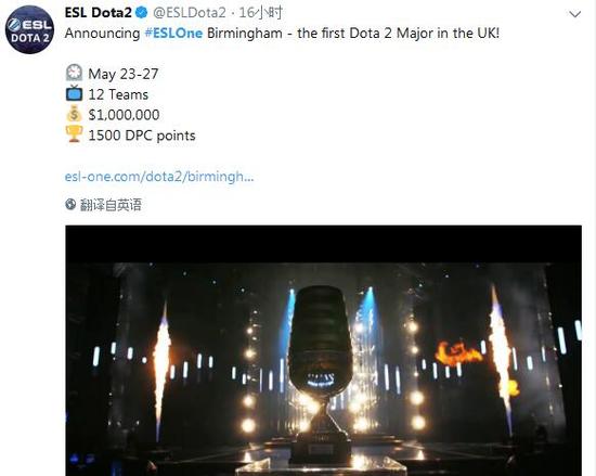 ESL ONE作为著名的赛事方,在DOTA2新赛季巡回赛中已经承办了汉堡Major,云顶Minor等赛事,近日,ESL One官方宣布,将在TI8前举办另一场Major级别的比赛,而举办地点为英国伯明翰,这也是DOTA2官方赛事首次来到英国。