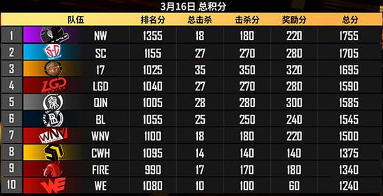 3月17日,企鹅QGC新春邀请赛再次起航,下半区的G组和H组可谓是强者如云,各支战队最终的总积分相差无几。NW 后两场发力,第四局6杀吃鸡后又在最后一局拿下了第二名的佳绩,总积分1755分排名第一,第二场比赛吃鸡的SC紧追其后,而排名第三的17无疑是今晚最耀眼的战队,一次都没有吃鸡的他们凭借35个人头的超高击杀数抢下击杀奖励分300分,总积分与SC战队仅仅相差10分,可谓是这次赛制的最大受益者。LGD今天在前中期的发挥不佳,难以保持整编阵容,他们与首局17杀吃鸡的QIN战队分列第4,5名。