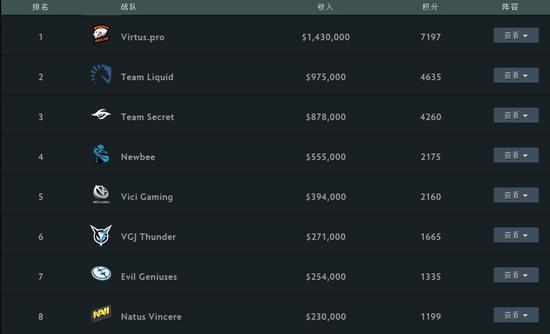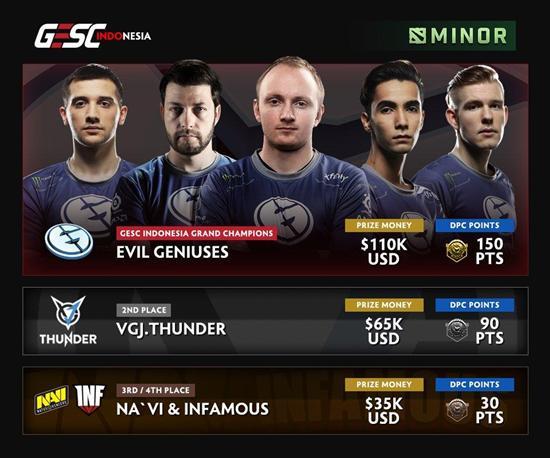 冠军EG战队获得150*3的积分,亚军VGJ.T获得90*3的积分,并列三四名的Na'Vi和Infamous各获得30*3的积分。