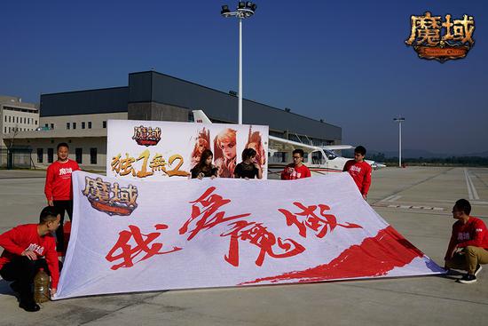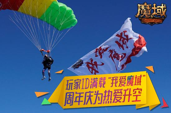 无邪、小刚、正伟、大飞、 刑天等几个玩家在飞天挑战中付诸行动,而其他无法到现场的玩家,也用他们自己的办法为《魔域》周年庆送上了礼物——一副写满了他们ID的旗帜在周年庆前赶制出来送到飞天挑战现场,而《魔域》也在4000米高空将之展开,让蔚蓝苍穹见证了这些玩家的热爱。