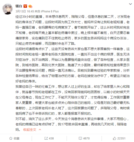 由于骚白长时间把心思花在直播以及和水友的互动上,对家人疏忽了照顾和陪伴,骚白在得知母亲的病情之后,才果断选择了停播,转身回到老家照顾母亲。直播的忙碌让骚白没有多余的时间去关心自己的亲人,甚至连春节都没能和家人吃上团圆饭。骚白一方面呼吁大家多陪伴自己的父母,另一方面也向关心他的水友粉丝们表示了感谢,待他尽完孝道,第一时间回到斗鱼直播。