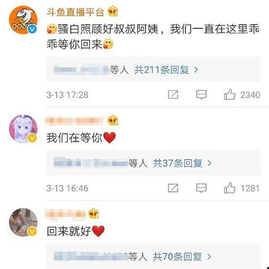在复播之前,已经有大批水友在黑屏的直播间为骚白的母亲送出祝福,而微博上更有斗鱼官方表达对骚白停播的理解与关心,“白家军”的粉丝们都在等待他的归来,隔着屏幕就能感受到粉丝们对骚白深深的爱意。