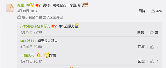 对于毛毛酱独占一个直播间的事,Gini小姐姐表示震惊:瓦特?毛毛独占一个直播间?粉丝们纷纷回复:排面,毕竟是团宠,地位已经超过他粑粑了。英凯更是表示,要为毛毛开铁粉,《王者荣耀》人气媒体玩加赛事重点指出,毛毛酱的直播间请重点关注!这样的阵势,如毛毛酱微博的介绍:QG大哥大,集万千宠爱于一身。