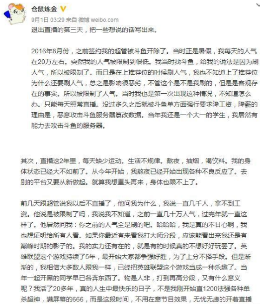 作为曾经小有名气的英雄联盟主播,仓鼠王被誉为是很励志的LOL主播。在虎牙直播之前,仓鼠炼金曾经是斗鱼的英雄联盟主播,并且人气维持在20万左右,算得上是平台一线主播之一,然而后来遭受到平台人气打压,并被要求降低工资,而这时期斗鱼还有多名英雄联盟主播被平台要求降薪。在被平台打压之后,最终选择与斗鱼解除合约后,因为梦想,依旧在斗鱼免费直播了2个月的时间。随后得到虎牙平台青睐,最终选择跳槽虎牙平台直播,并且坚持直播了半年时间。