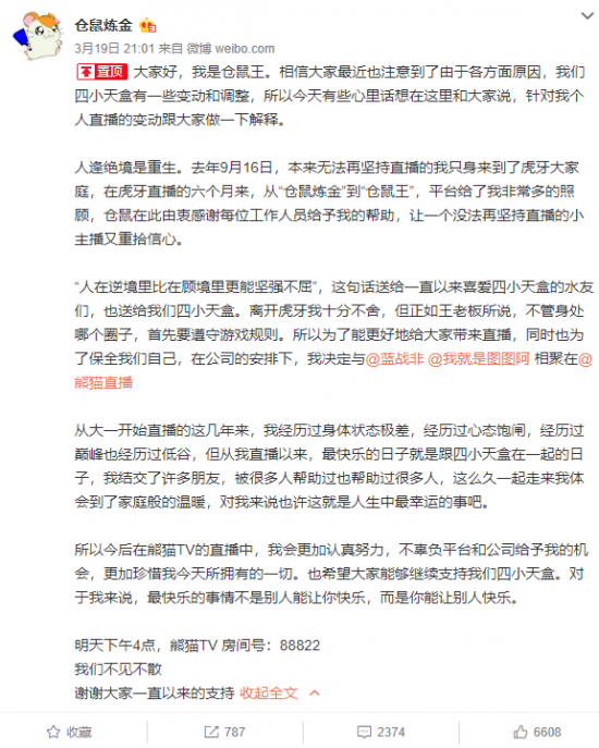 昨晚,虎牙英雄联盟主播仓鼠王宣布为了更好的进行直播,决定与好友蓝战非等主播相聚在熊猫平台,以后将跳槽到熊猫平台进行直播,并且将转型成绝地求生主播。