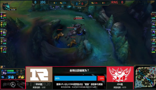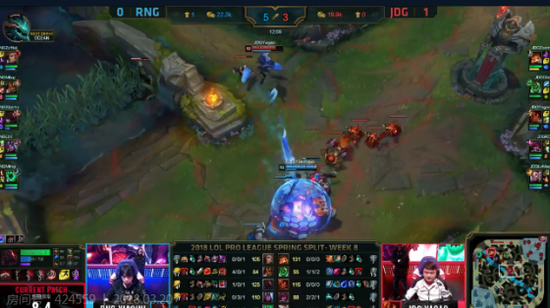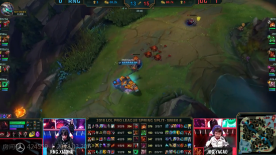 大后期,JDG利用RNG的塔下失误拿下了上路高地后,兵线牵制拿下大龙。拿到大龙的JDG中路灭掉RNG三人后一波拿下胜利。