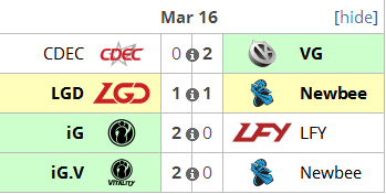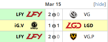 3月15日LFY战队似乎找到了自己去年在Ti7中的良好状态,他们将VG战队和VG.P斩落马下,俨然成为了联赛前3天表现最佳的队伍。iG.V和LGD则握手言和。