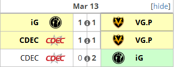 3月13日揭幕战共有三支战队出战, iG、VG.P、CDEC分别出战两场,三个队伍打了一个小循环。iG在这一循环中脱颖而出,获得一胜一平的好成绩。